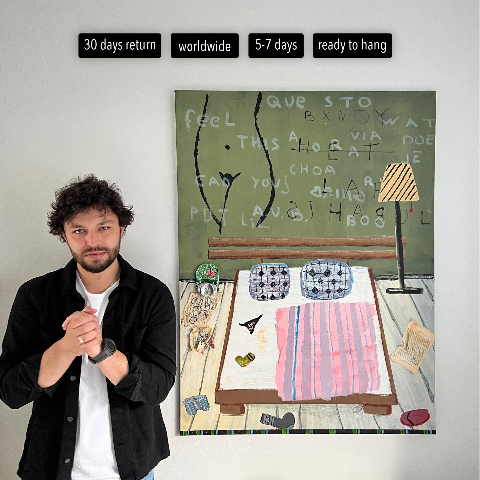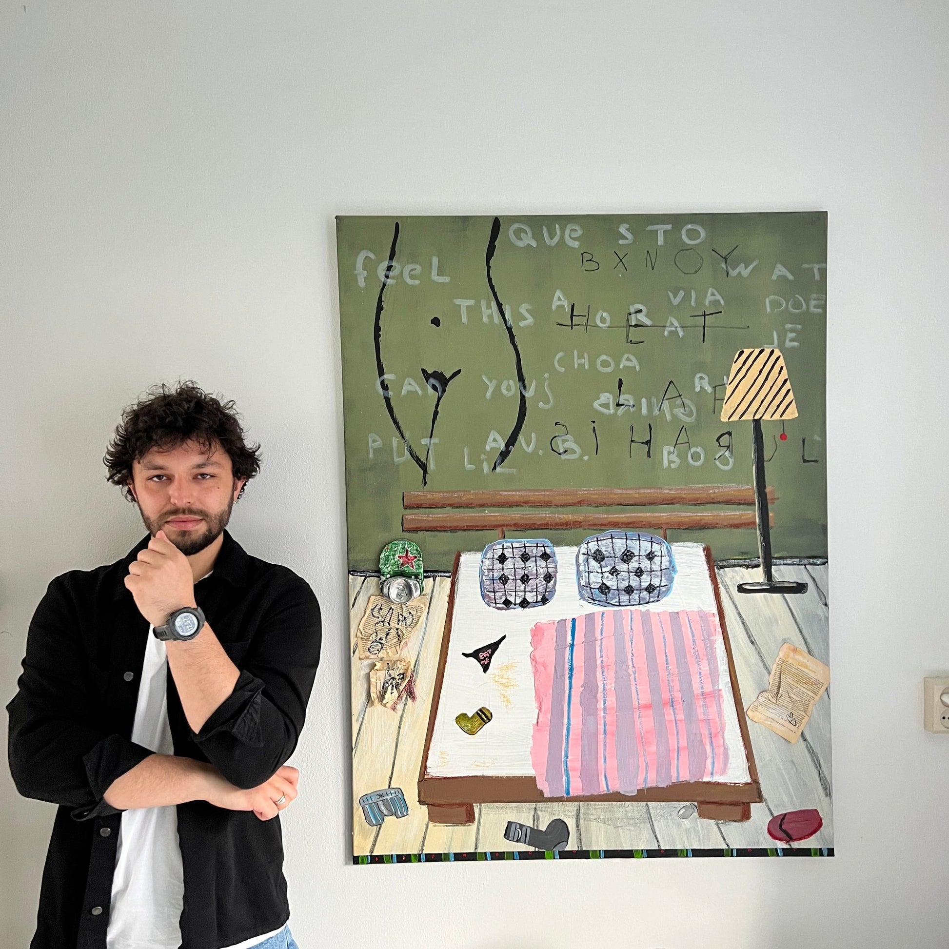 Gio Manveli used to spend his days in meetings and spreadsheets—until one day he noticed how beautiful a messy chair looked in the corner of his room. That little moment changed everything. Now, he paints the quiet, honest parts of life—beds that aren’t made, messy dining table with underwear on it, and outgoing characters enjoying Amsterdam life. His art feels like walking into someone’s memory. Gio believes walls should have stories, not just decorations—and he’s here to help yours tell one.