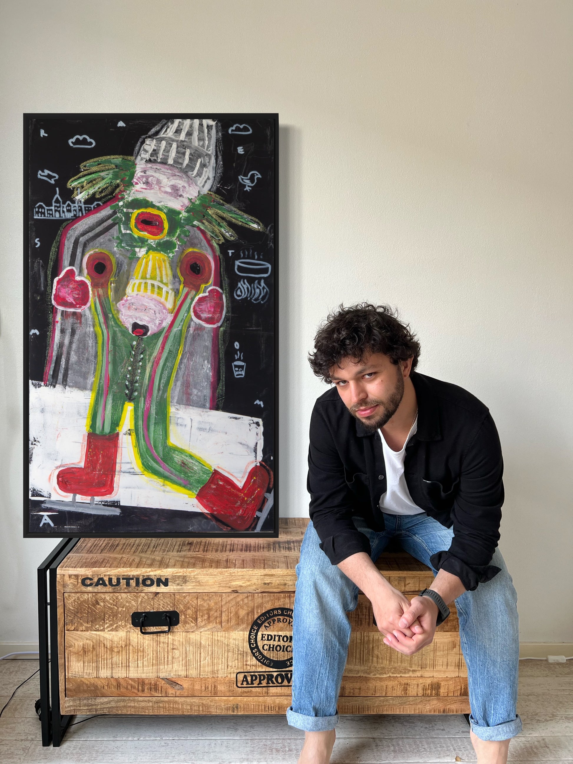 Gio Manveli used to spend his days in meetings and spreadsheets—until one day he noticed how beautiful a messy chair looked in the corner of his room. That little moment changed everything. Now, he paints the quiet, honest parts of life—beds that aren’t made, messy dining table with underwear on it, and outgoing characters enjoying Amsterdam life. His art feels like walking into someone’s memory. Gio believes walls should have stories, not just decorations—and he’s here to help yours tell one.