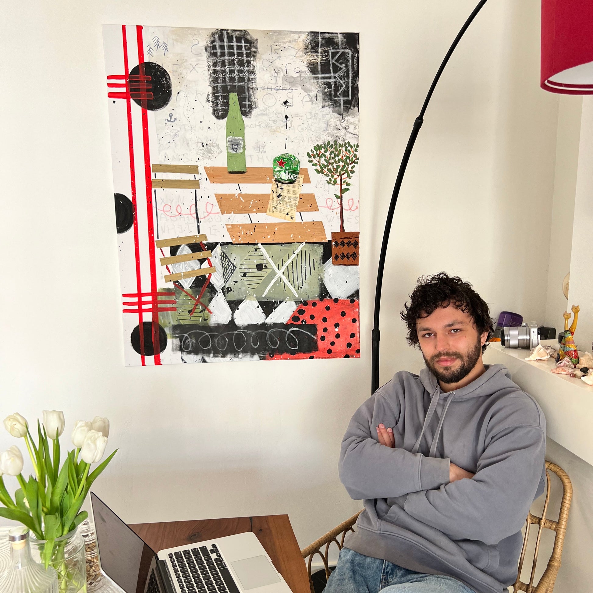Gio Manveli used to spend his days in meetings and spreadsheets—until one day he noticed how beautiful a messy chair looked in the corner of his room. That little moment changed everything. Now, he paints the quiet, honest parts of life—beds that aren’t made, messy dining table with underwear on it, and outgoing characters enjoying Amsterdam life. His art feels like walking into someone’s memory. Gio believes walls should have stories, not just decorations—and he’s here to help yours tell one.
