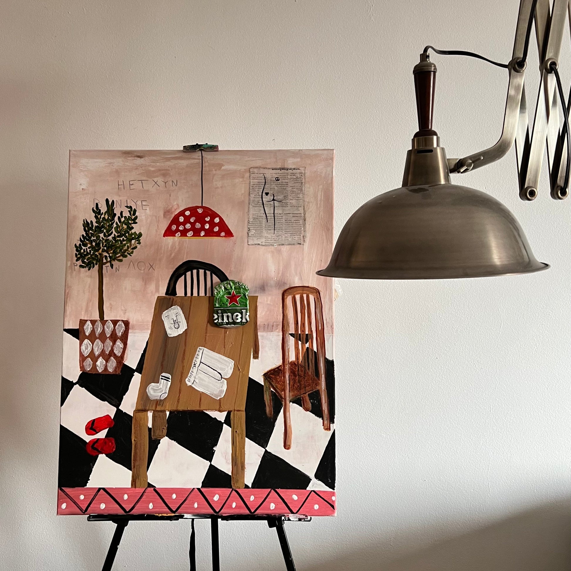 Gio Manveli used to spend his days in meetings and spreadsheets—until one day he noticed how beautiful a messy chair looked in the corner of his room. That little moment changed everything. Now, he paints the quiet, honest parts of life—beds that aren’t made, messy dining table with underwear on it, and outgoing characters enjoying Amsterdam life. His art feels like walking into someone’s memory. Gio believes walls should have stories, not just decorations—and he’s here to help yours tell one.